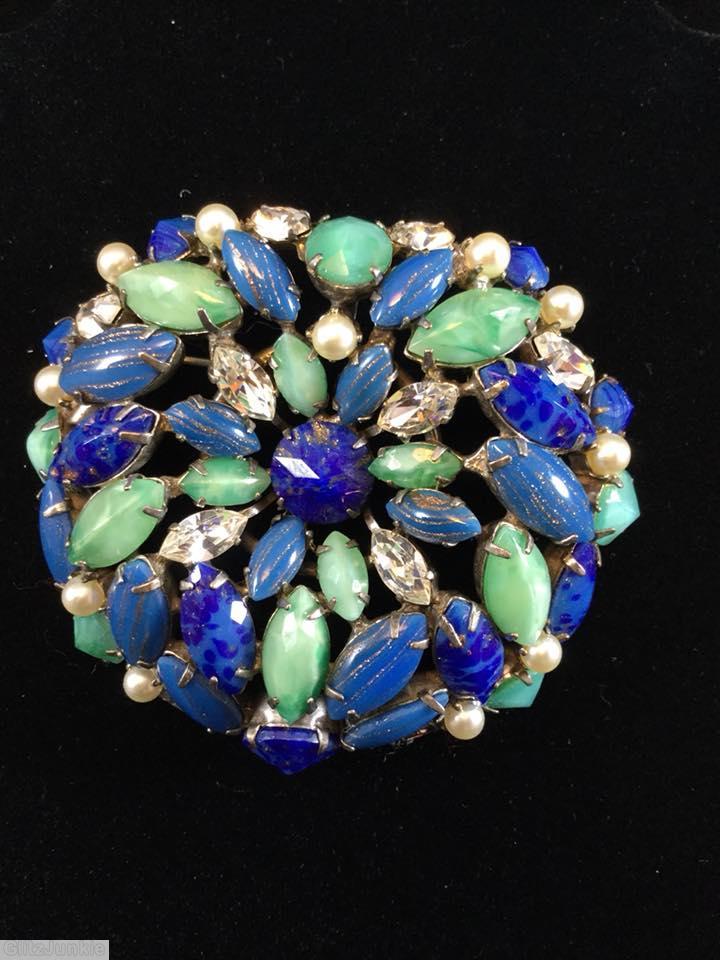 brand: SCHREINER style ID: identification: • Signed piece(s) with the same structure: 1C35PH-001 , MZ1VXK-001 structure: domed radial flat top round pin, chaton center, 12 surrounding small navette design elements: gold fluss brown, turquoise, peridot, faux pearl seeds tracked pieces: Submit one like this Style *1C35PH (scroll down to see related pieces and different styles in this series.)