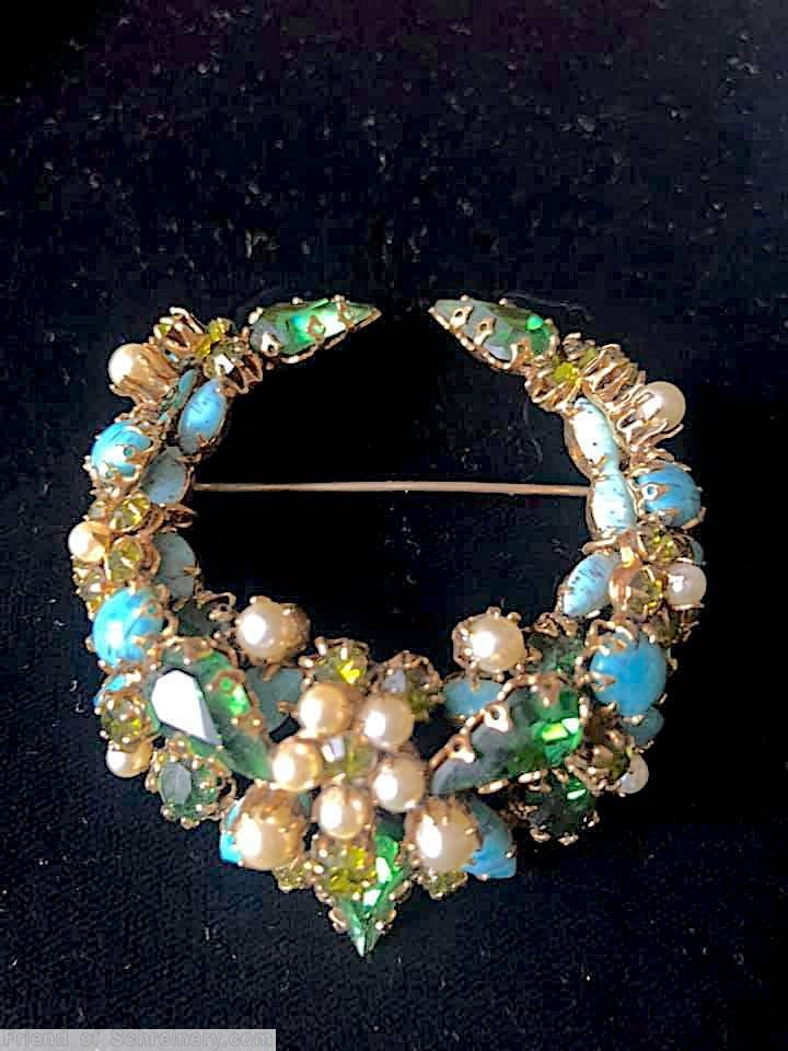 brand: SCHREINER style ID: identification: • Signed piece(s) with the same structure: SOEUR2-001 , 382IQW-001 , K4BVVG-001 structure: crescent pin design elements: apple green navette, ice blue navette, aqua oval stone, peach navette, bicolor white green jelly bean, goldtone tracked pieces: Submit one like this Style *382IQW (scroll down to see related pieces and different styles in this series.)
