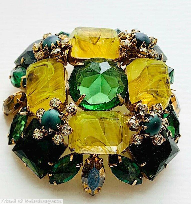 brand: SCHREINER style ID: identification: • Signed piece(s) with the same structure: Z3V040-001 , 52V4TP-001 structure: domed radial square pin, 4 large square corner stone, 4 large emerald cut side, large chaton center design elements: marbled smoke, clear aqua, turquoise, peridot, amber tracked pieces: Submit one like this Style *52V4TP (scroll down to see related pieces and different styles in this series.)