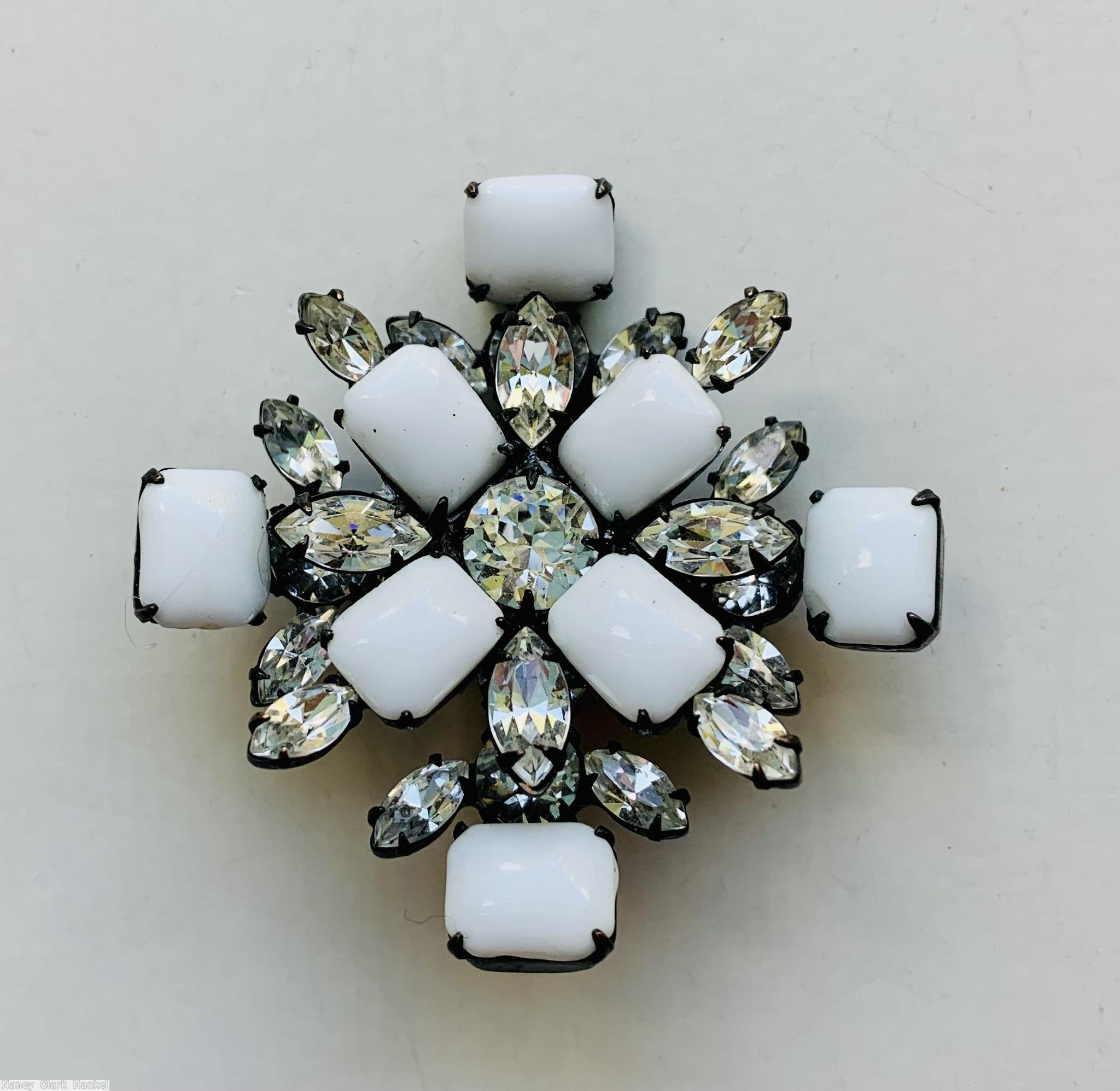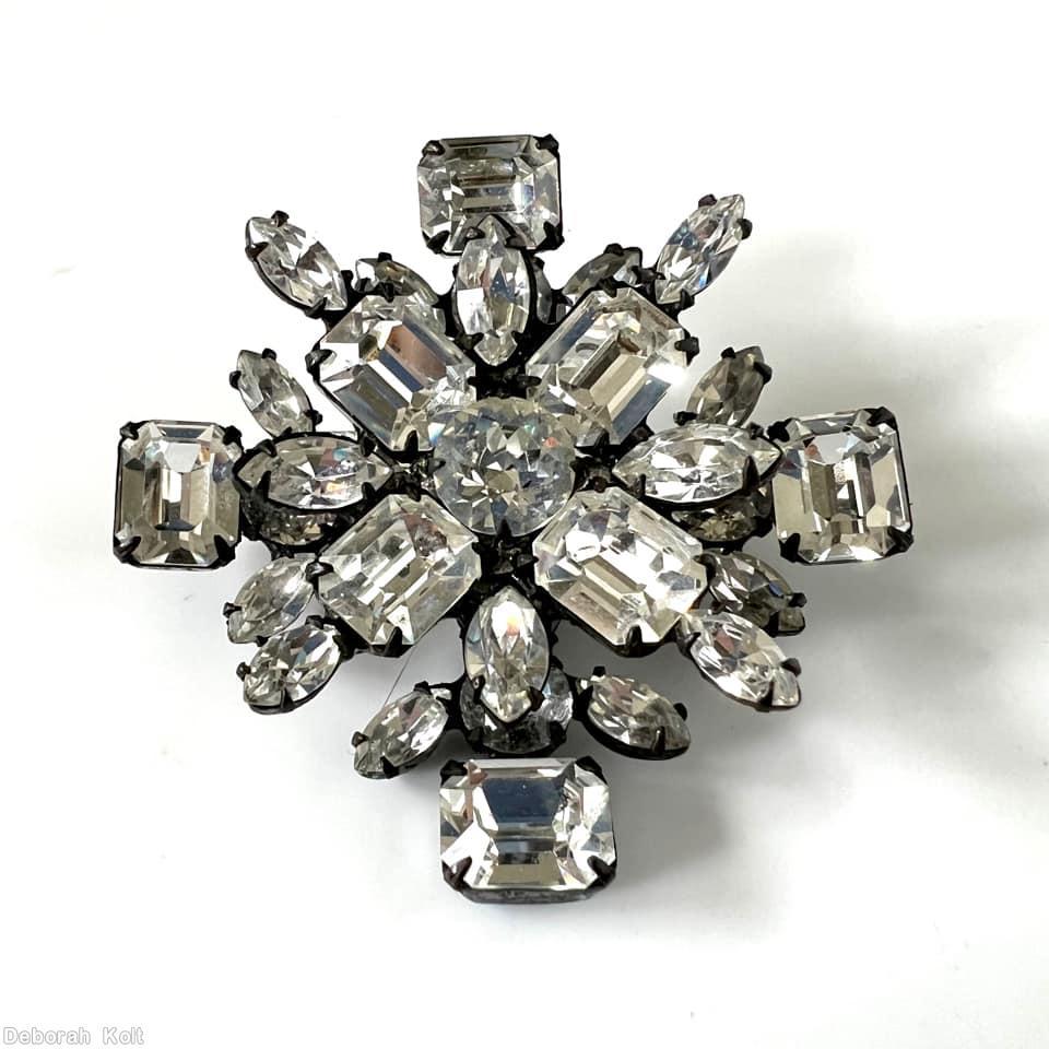 2 level radial cross pin, top level chaton center, 4 emerald cut 4 navette surrounding, bottom 4 emerald cut, 12 navette