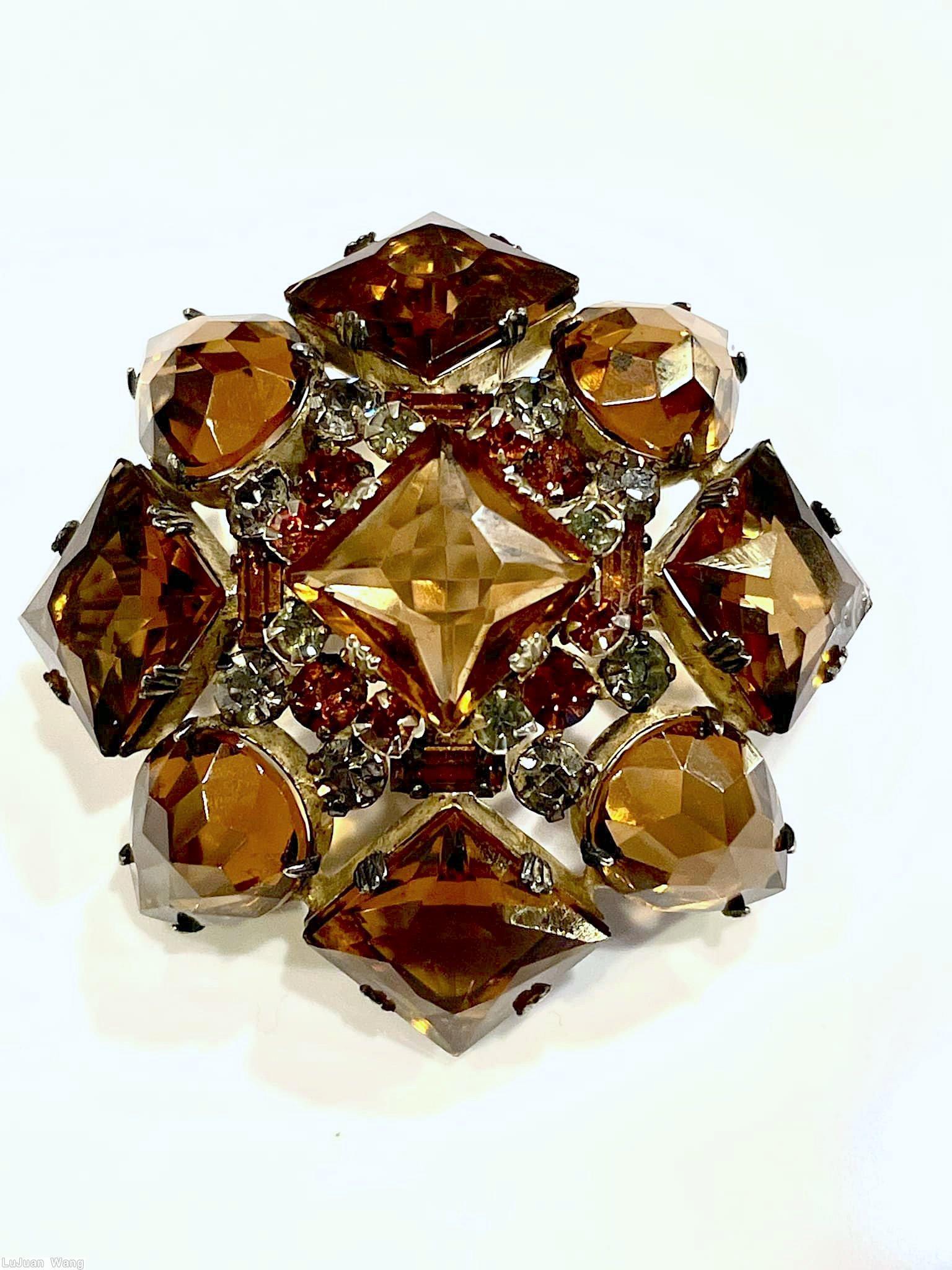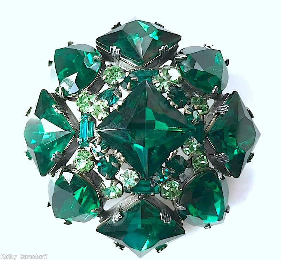 brand: SCHREINER style ID: identification: • signed piece(s) NQB918-001 . structure: domed square pin, large faceted square center stone, 4 large square faceted corner stone, 4 large teardrop design elements: faceted aqua square crystal, green faceted teardrop, green small baguette, peridot small chaton tracked pieces: Submit one like this Style *JEJTKO (scroll down to see related pieces and different styles in this series.)