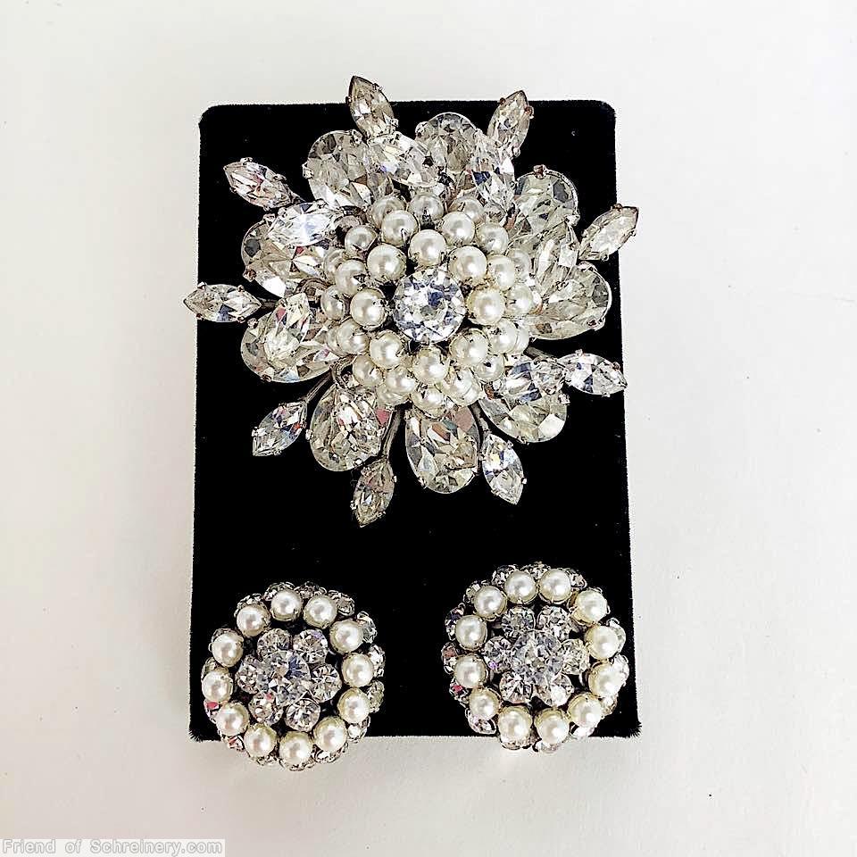 brand: SCHREINER style ID: identification: • signed piece(s) M10HYZ-001 . structure: 9 large oval cab radial round pin, 2 level, top level 8 tilted navette, bottom level 9 navette, clustered ball center design elements: smoky blue, clear champagne navette, red, crystal tracked pieces: Submit one like this Style *M7E12T (scroll down to see related pieces and different styles in this series.)