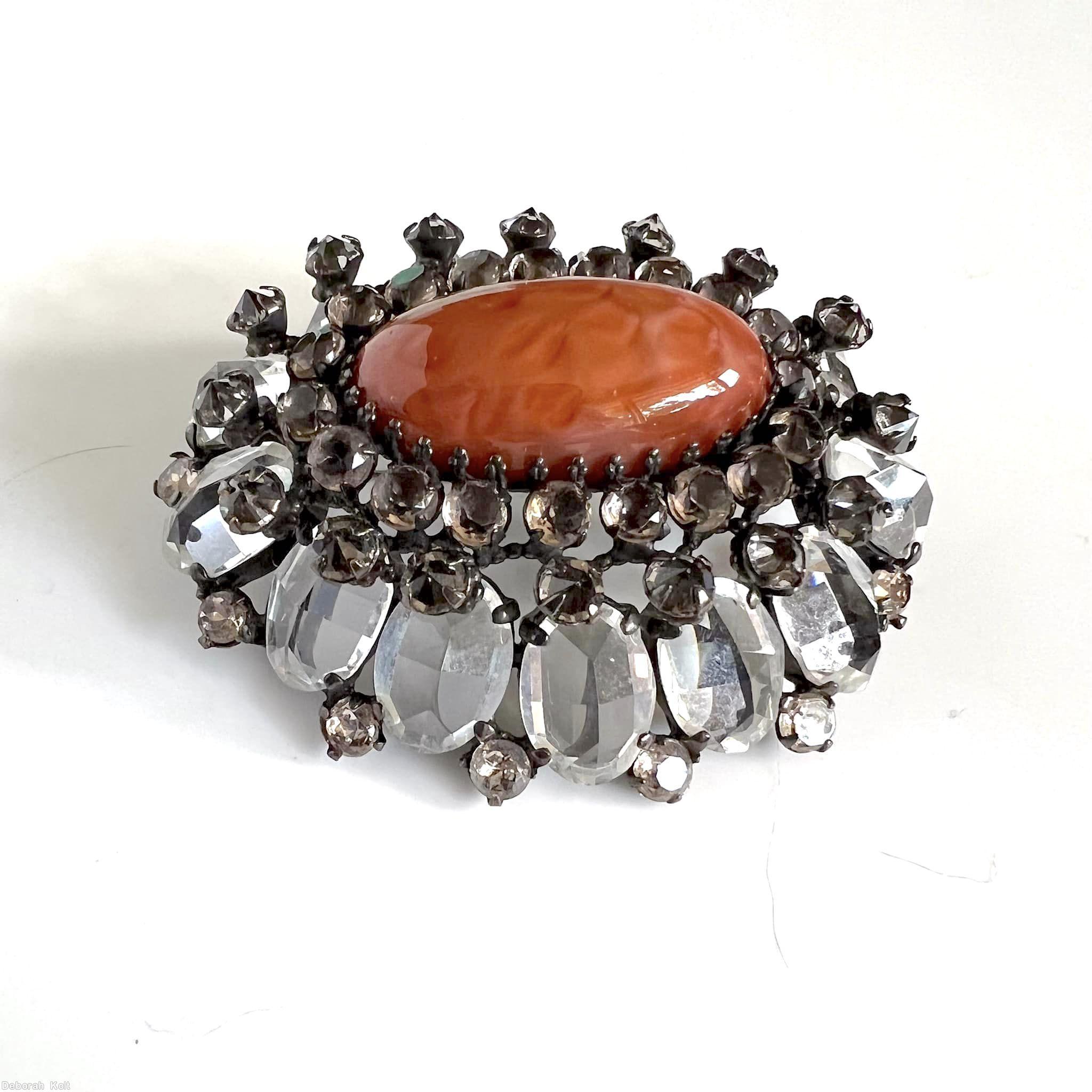 crystal oval faceted stone, jet large oval cab center, faux pearl, silvertone