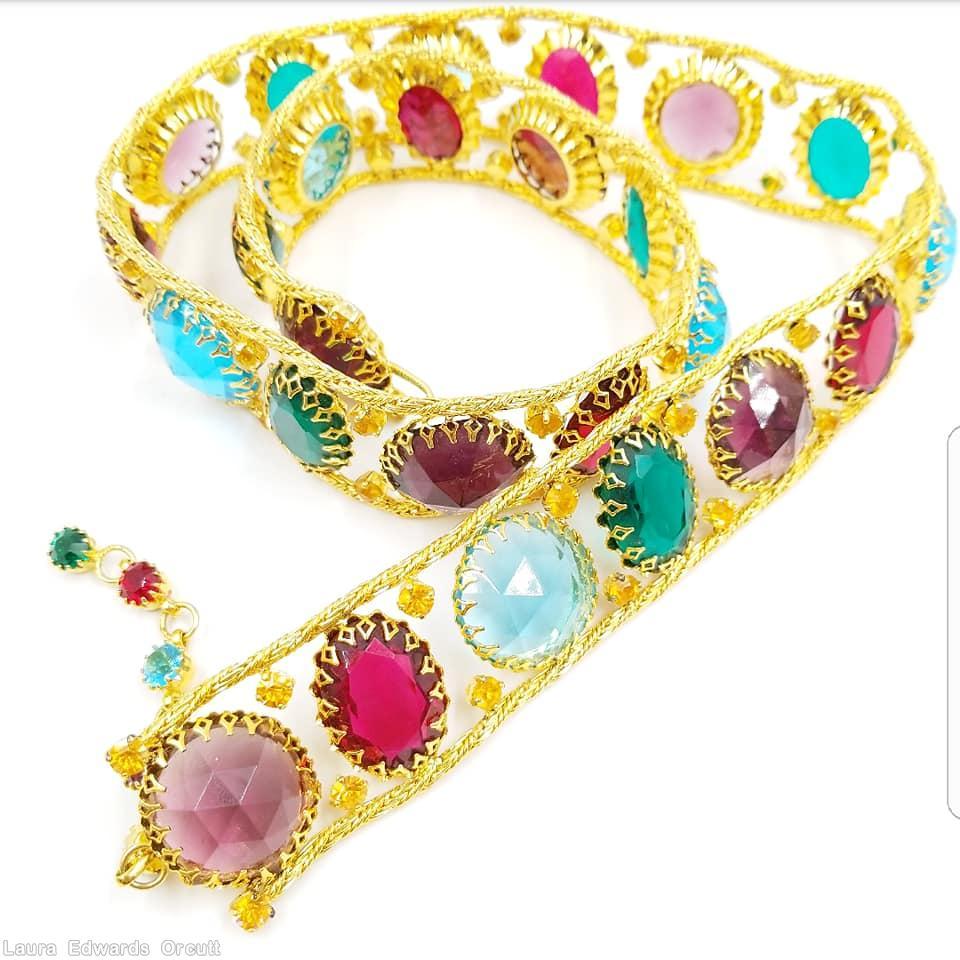 goldtone, open back large faceted disc, ice lavender, ice amber, green, ice blue