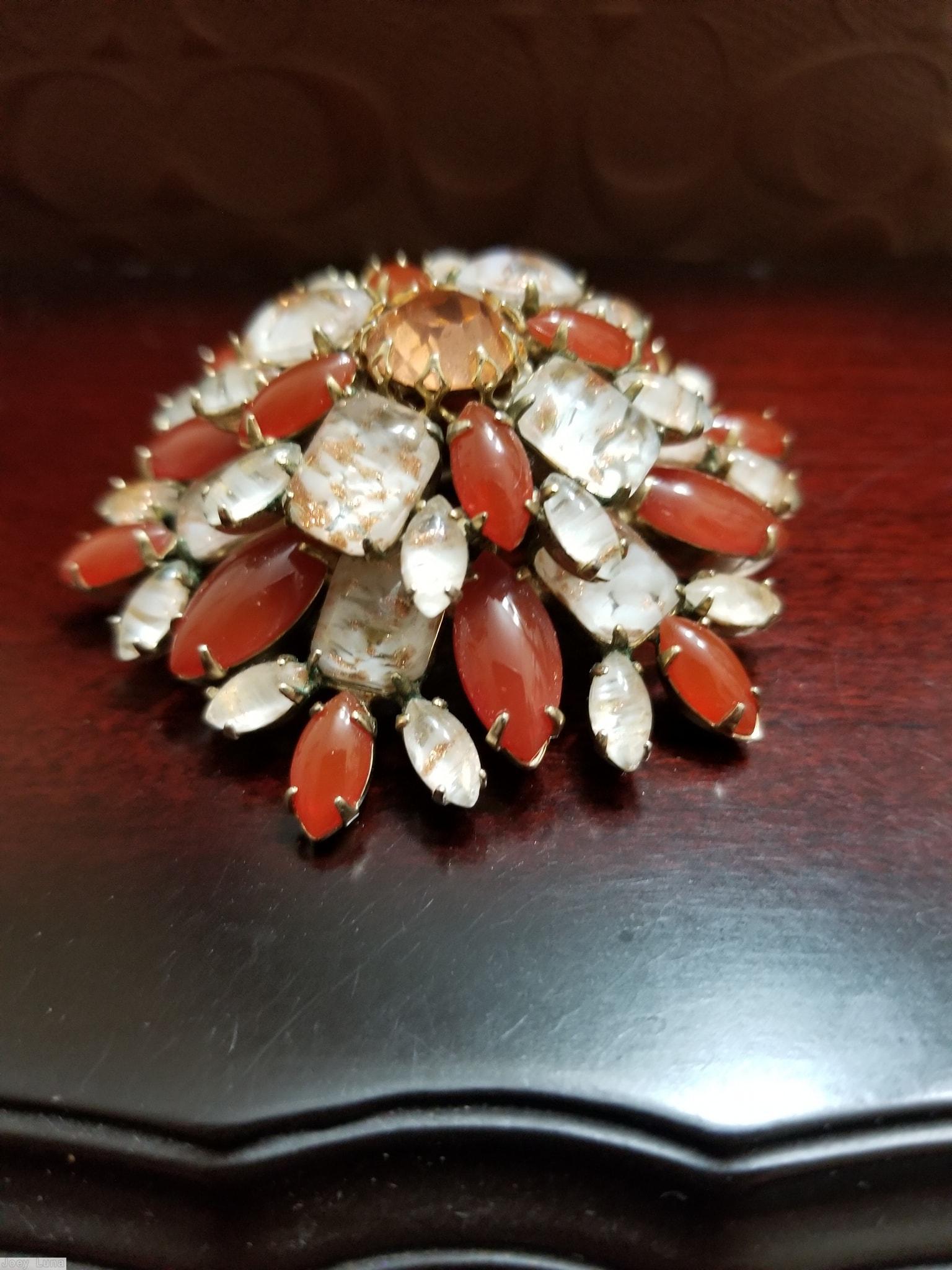 brand: SCHREINER style ID: identification: Concluded by this discussion on Facebook Study Groups structure: 2 level domed radial pin, top leve, 4 emerald cut, 4 navette, chatton center, bottom level, 6 large navette, 6 emerald cut design elements: ice blue, emerald tracked pieces: Submit one like this Style *T4MRPS (scroll down to see related pieces and different styles in this series.)