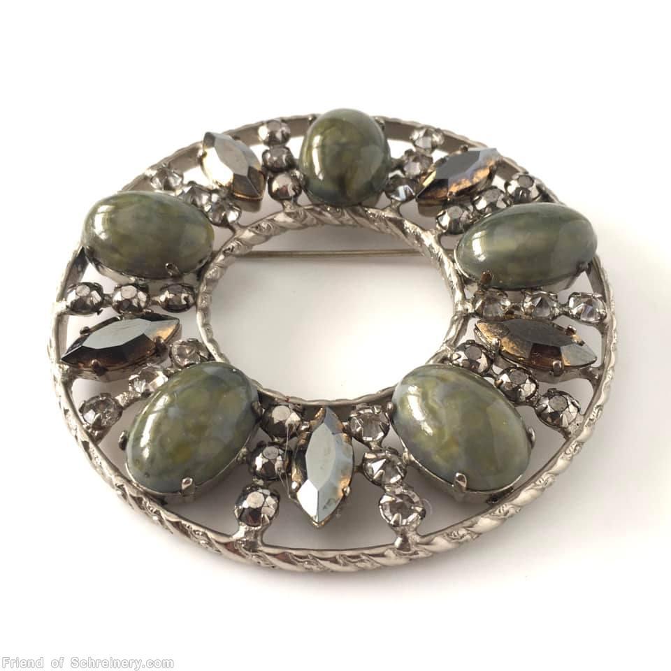 brand: SCHREINER style ID: identification: • Signed piece(s) with the same structure: TH1HMT-001 , DTW58K-001 structure: round shaped shadow box radial pin, ornamental metal frame, 5 large oval stone, 5 large jelly bean design elements: oval green jade nuget, amber faceted navette, moonglow apple green small chaton tracked pieces: Submit one like this Style *TH1HMT (scroll down to see related pieces and different styles in this series.)