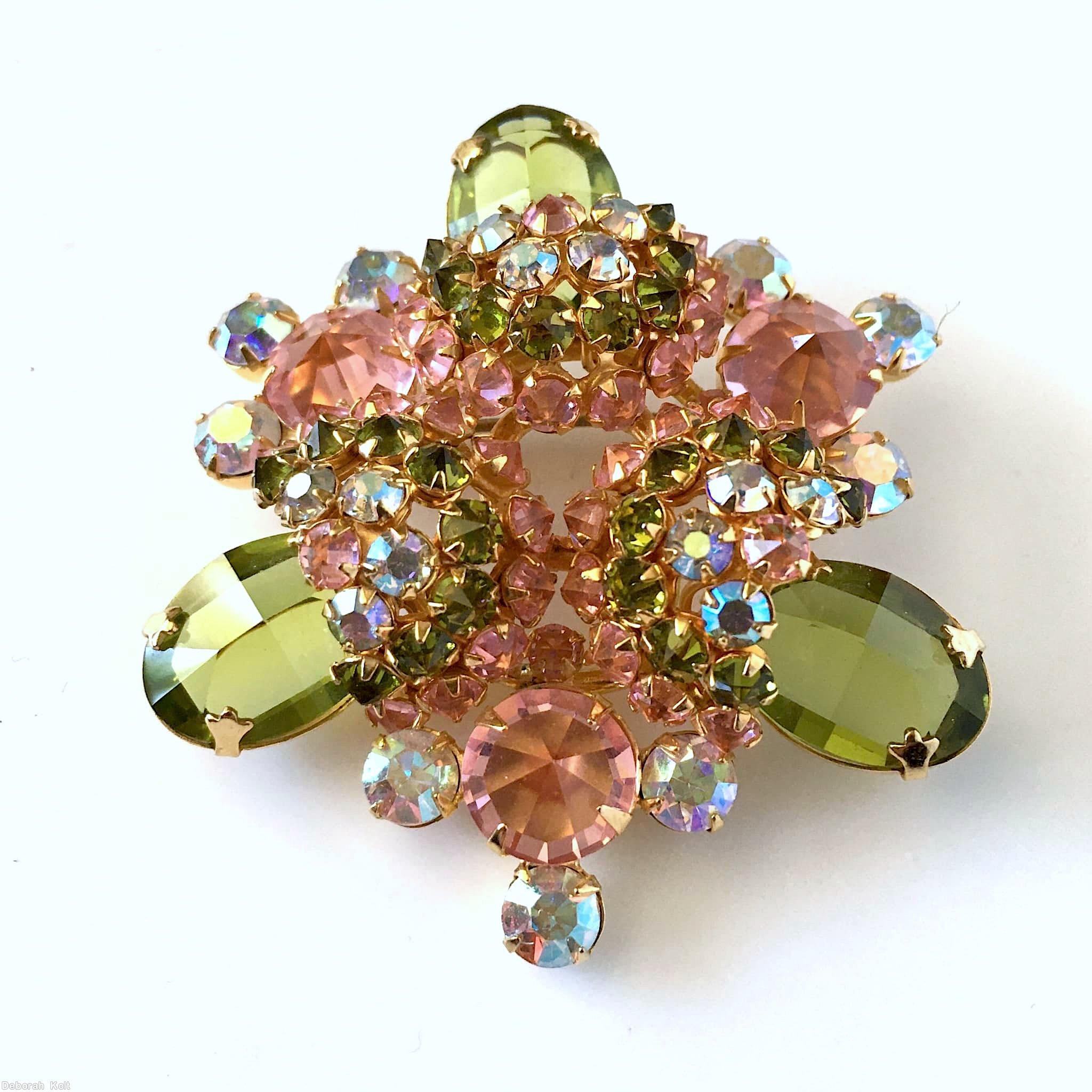 brand: SCHREINER style ID: identification: • Signed piece(s) with the same structure: SQZ685-001 , YVLFFN-001 structure: 3 acorn radial triangle pin, 3 large round stone design elements: topaz large faceted oval stone, smoky chaton, faux pearl, faceted inverted clear champagne, goldtone tracked pieces: Submit one like this Style *YVLFFN (scroll down to see related pieces and different styles in this series.)