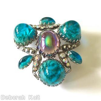 brand: SCHREINER style ID: identification: • signed piece(s) MCC63F-001 . structure: triangle radial pin, 3 large round cab, 6 leaf shaped metal with varied size chaton embedded, large oval cab center, 3 navette design elements: marbled aqua round large cab, ab pink large oval center, crystal chaton, silvertone tracked pieces: Submit one like this Style *4OIH06 (scroll down to see related pieces and different styles in this series.)
