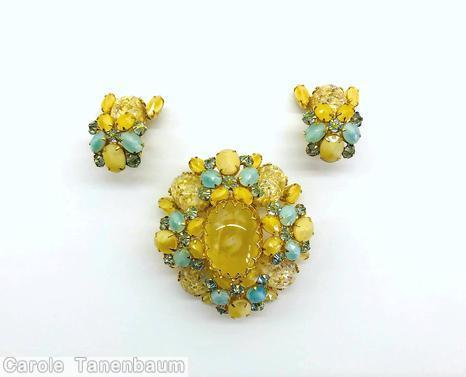brand: SCHREINER style ID: identification: • book piece(s) in "Schreiner - Master of 20th-Century Costume Jewelry" by Carole Tanenbaum and Eve Townsend , page 101. • signed piece(s) CTUV59-001 , XU13ZE-002 , XU13ZE-001 , 244HXO-001 , FU6VEO-001 , Q0O0TN-001 . structure: 4 large oval cab corner radial rectangle pin, 1 large oval cab center design elements: swirled jonqil large oval cab, gold stippled yellow large oval stone, moonglow greenish blue small oval stone, moonglow jonquil, goldtone tracked pieces: Submit one like this Style *4VVIR0 (scroll down to see related pieces and different styles in this series.)