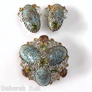 brand: SCHREINER style ID: identification: • Signed piece(s) with the same structure: 6EPMZ7-001 , 3M82N5-001 structure: high domed radial 3 large oval cab pin, scrollwork, 3 large chaton, 21 small chaton design elements: brown marbled turquoise large oval cab, peridot, topaz, silvertone tracked pieces: Submit one like this Style *6EPMZ7 (scroll down to see related pieces and different styles in this series.)