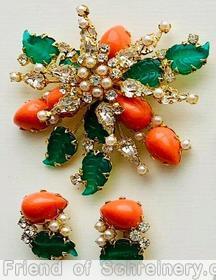 brand: SCHREINER style ID: identification: • book piece(s) in "Schreiner - Master of 20th-Century Costume Jewelry" by Carole Tanenbaum and Eve Townsend , page 50,159,cover. structure: 7 carved leaf 2 level radial pin, top level 6 teardrop, bottom level 5 large teardrop cab, 5 small teardrop design elements: green carved leaf, coral, crystal, faux pearl, goldtone tracked pieces: Submit one like this Style *AWDUZF (scroll down to see related pieces and different styles in this series.)