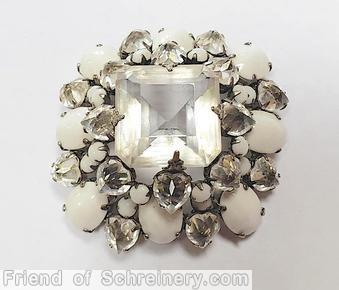 brand: SCHREINER style ID: identification: • Signed piece(s) with the same structure: AWIAC1-001 structure: 16 heart stone large faceted crystal center domed rectangle pin, 8 oval cab, 2 rounds surrounding, 8 groups of 2 small chaton design elements: crystal large hexagon faceted open back center stone, crystal heart stone, white, silvertone tracked pieces: Submit one like this Style *AWIAC1 (scroll down to see related pieces and different styles in this series.)