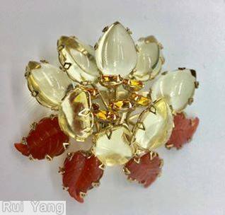 clear champagne, siam red engraved leaf, yellow, goldtone