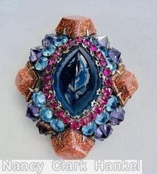 navy large oval cab center, inverted fuchsia, gold speckled large emerald cut corner, violet, ice blue, silvertone