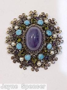 brand: SCHREINER style ID: identification: • Signed piece(s) with the same structure: F73623-001 , H1Y90T-001 structure: oval 16 metal flower radial pin, large oval cab center, 8 surrounding small navette, 8 small chaton design elements: large marbled purple oval cab center, turquoise small round cab, peridot inverted stone, faux pearl, silvertone tracked pieces: Submit one like this Style *F73623 (scroll down to see related pieces and different styles in this series.)