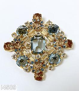 | brand: | SCHREINER | | style ID: | | | identification: | • signed piece(s) JI3QSM-001, 3UJSMN-001. | | structure: | diamond shaped radial pin, elongated hexagon center stone, 4 large round cab, 4 flower head of 6 chatons surrounding 1 chaton, 8 small baguette, 4 small round cab | | design elements: | clear champagne small baguette, smoky blue large faceted chaton, blue small inverted, small inverted crystal, faceted round topaz, goldtone | tracked pieces: | | | Submit one like this | Style *FKHXTJ (scroll down to see related pieces and different styles in this series.) |