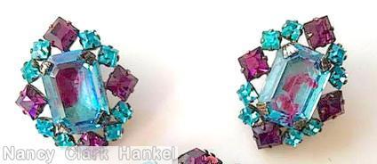 brand: SCHREINER style ID: identification: • other piece(s) KKSSPS . structure: 4 small square stone 8 small chaton surrounding 1 large emeral cut center stone, radial diamond shaped design elements: clear aqua chaton, purple small faceted square, bicolor purple aqua emerald cut, silvertone tracked pieces: Submit one like this Style *H0048F (scroll down to see related pieces and different styles in this series.)