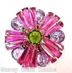 brand: SCHREINER style ID: identification: • signed piece(s) QACANH-001 . structure: 5 group 15 keystone radial ruffle pin, large chaton center, 5 large chaton, 5 small chaton design elements: peridot faceted chaton center, fuchsia keystone, ice lavender faceted chaton tracked pieces: Submit one like this Style *H3PB5W (scroll down to see related pieces and different styles in this series.)