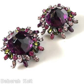 brand: SCHREINER style ID: identification: • other piece(s) 11YF22 . structure: large round cab center radial earring, 18 surrounding stone of small navette chaton, 12 outside small navette design elements: purple large faceted rose cut round cab, peridot small navette, ice pink small navette, fuschia small chaton, silvertone tracked pieces: Submit one like this Style *IYZL1M (scroll down to see related pieces and different styles in this series.)