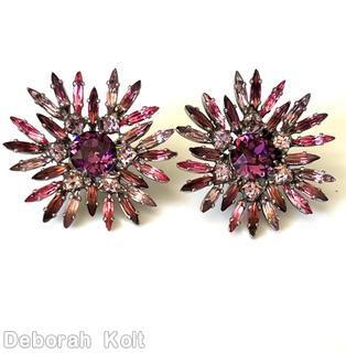 brand: SCHREINER style ID: identification: • Signed piece(s) with the same structure: JKJD7U-001 structure: many navette radial earring, 1 large faceted round stone center, 6 small surrounding chaton, 24 outside navette design elements: purple faceted large round stone center, peach small chaton, pink navette, lavender navette, silvertone tracked pieces: Submit one like this Style *JKJD7U (scroll down to see related pieces and different styles in this series.)
