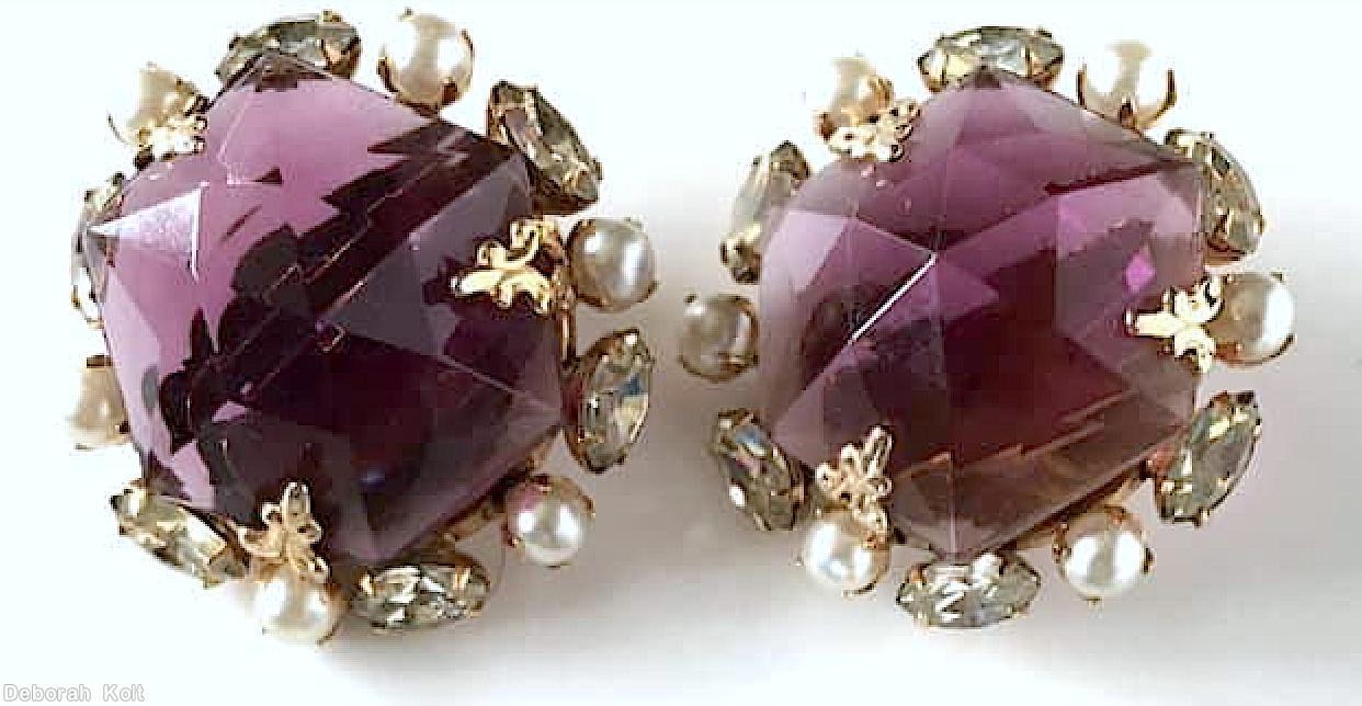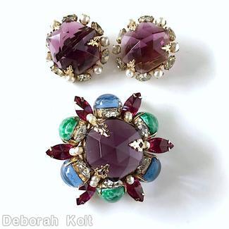 brand: SCHREINER style ID: identification: • book piece(s) in "Schreiner - Master of 20th-Century Costume Jewelry" by Carole Tanenbaum and Eve Townsend , page 78. structure: mile high domed round pin, 6 large oval side stone, large round top stone, 6 navette design elements: large hexagonal rose cut purple stone, blue large oval cab, large oval speckled jade cab, crystal navette, faux pearl, fuschia large navette, goldtone tracked pieces: Submit one like this Style *K0CZ46 (scroll down to see related pieces and different styles in this series.)