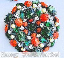 brand: SCHREINER style ID: identification: • book piece(s) in "Schreiner - Master of 20th-Century Costume Jewelry" by Carole Tanenbaum and Eve Townsend , page 130,162. • signed piece(s) AN3NWO-001 , 662FJM-001 , JRJ8X3-001 , 2AI1LK-001 , H7WHTJ-001 , U1B7FT-001 , IUMP19-001 . structure: hexagonal domed radial concave flat top pin, small chaton center, 6 surrounding navette, 6 round stone on side wall design elements: gold fluss dark green, matrix coral, crystal, moonglow white, japanned tracked pieces: Submit one like this Style *M9FR1S (scroll down to see related pieces and different styles in this series.)