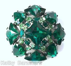 brand: SCHREINER style ID: identification: • Signed piece(s) with the same structure: NQB918-001 structure: domed square pin, large faceted square center stone, 4 large square faceted corner stone, 4 large teardrop design elements: emerald, apple green, silvertone tracked pieces: Submit one like this Style *NQB918 (scroll down to see related pieces and different styles in this series.)