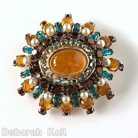 | brand: | SCHREINER | | style ID: | | | identification: | • Signed piece(s) with the same structure: ZAJ2CF-001, NSOIOV-001, W0FBNC-001, YPKWKX-001, NIKV3F-001 | | structure: | 5 rounds varied length domed radial oval pin, large oval center, 16 small surrounding chaton, small baguette | | design elements: | swirled topaz large oval cab center, ice blue small chaton, metallic chocolate chaton, blue small baguette, faux pearl, goldtone | tracked pieces: | | | Submit one like this | Style *NSOIOV (scroll down to see related pieces and different styles in this series.) |