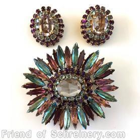 brand: SCHREINER style ID: identification: • book piece(s) in "Schreiner - Master of 20th-Century Costume Jewelry" by Carole Tanenbaum and Eve Townsend , page 82. • book piece(s) in "Rhinestones!" by Nancy N. Schiffer , page 81. structure: navette ruffle pin, hook eye, domed, oval center, 2 rounds surrounding stone design elements: aqua, plum, peach, large faceted crystal, inverted clear aqua, purple small baguette tracked pieces: Submit one like this Style *NY5SBJ (scroll down to see related pieces and different styles in this series.)
