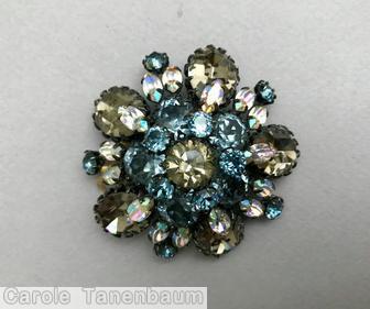 brand: SCHREINER style ID: identification: • Signed piece(s) with the same structure: 1WQEU3-001 , WH0OVE-001 , OFF33H-001 , ETYNDB-001 , 0QVEOZ-001 structure: 5 large emerald cut domed radial round pin, 5 stone star center, 5 large oval cab, 15 small baguette design elements: crystal, clear champagne, ice blue tracked pieces: Submit one like this Style *OFF33H (scroll down to see related pieces and different styles in this series.)