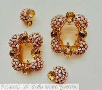 brand: SCHREINER style ID: identification: This piece is Verified. Editors are working on the references structure: 4 half clustered ball corner rectangle pin, large faceted open back center stone, 4 large chaton design elements: opaque pink, ab, amber, large faceted open back crystal, goldtone tracked pieces: Submit one like this Style *R5ZXDL (scroll down to see related pieces and different styles in this series.)