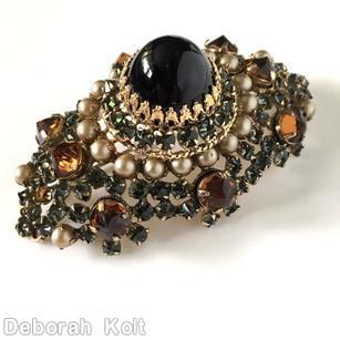 jet large round cab center, metalic pearl, topaz large inverted stone, jet small stone, goldtone