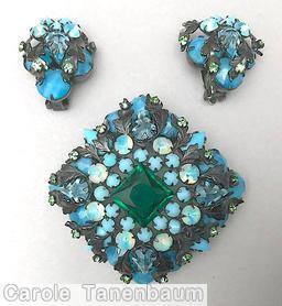 brand: SCHREINER style ID: identification: This piece is Verified. Editors are working on the references structure: 16 metal leaf domed square pin, 12 chaton, square center, 4 teardrop corner design elements: emerald square faceted stone, opaque ice blue, baby blue, ice blue, black metal leaf, japanned tracked pieces: Submit one like this Style *SBXQR6 (scroll down to see related pieces and different styles in this series.)