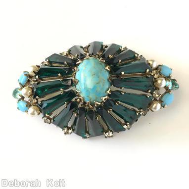 turquoise large oval cab center, emerald keystone, opaque baby blue small oval cab, faux pearl, ice blue small oval stone, small crystal chaton