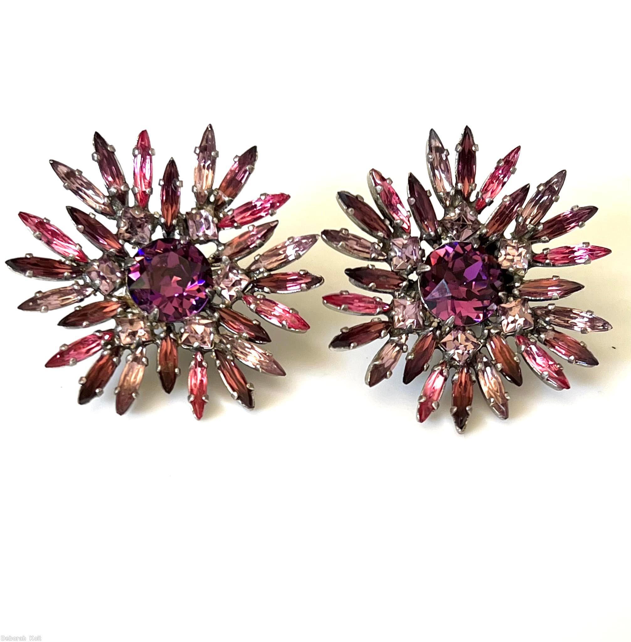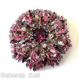 brand: SCHREINER style ID: identification: • Signed piece(s) with the same structure: UUXHKU-001 structure: round shaped flat top radial navette pin, large chaton center, 6 small square surrounding stone, 6 navette surrounding stone, 8 large square stone design elements: purple faceted large round stone center, peach small square stone, pink navette, clear ice pink square stone, lavender navette, silvertone tracked pieces: Submit one like this Style *UUXHKU (scroll down to see related pieces and different styles in this series.)