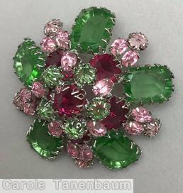 brand: SCHREINER style ID: identification: • Signed piece(s) with the same structure: 1WQEU3-001 , WH0OVE-001 , OFF33H-001 , ETYNDB-001 , 0QVEOZ-001 structure: 5 large emerald cut domed radial round pin, 5 stone star center, 5 large oval cab, 15 small baguette design elements: celery, pale pink, raspberry tracked pieces: Submit one like this Style *WH0OVE (scroll down to see related pieces and different styles in this series.)