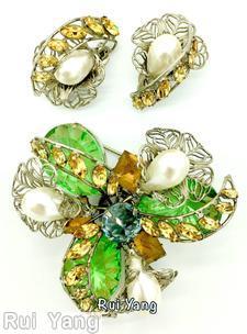 brand: SCHREINER style ID: identification: • Signed piece(s) with the same structure: C7LP7X-001 , Y3BIA9-001 , CTTSYR-001 structure: 3 wired ribbon filigree swirled triangle pin, 3 swirled wired ribbon, 3 bead, 3 cracked ice teardrop, filigree design elements: green cracked ice stone, faux pearl, amber, pale aqua, silvertone tracked pieces: Submit one like this Style *Y3BIA9 (scroll down to see related pieces and different styles in this series.)