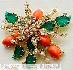 brand: SCHREINER style ID: identification: • book piece(s) in "Schreiner - Master of 20th-Century Costume Jewelry" by Carole Tanenbaum and Eve Townsend , page 50,159,cover. structure: 7 carved leaf 2 level radial pin, top level 6 teardrop, bottom level 5 large teardrop cab, 5 small teardrop design elements: green carved leaf, coral, crystal, faux pearl, goldtone tracked pieces: Submit one like this Style *Y6LYVH (scroll down to see related pieces and different styles in this series.)