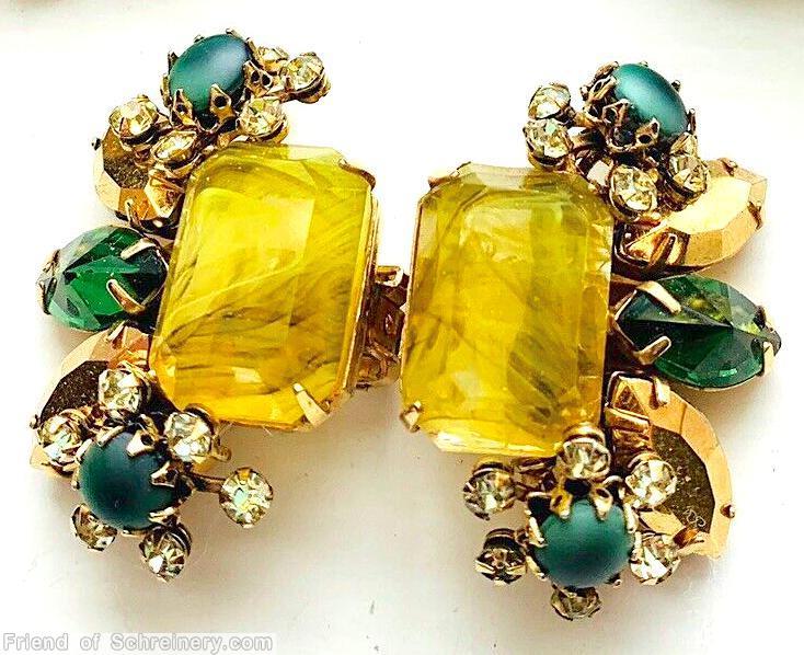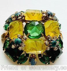brand: SCHREINER style ID: identification: • Signed piece(s) with the same structure: Z3V040-001 , 52V4TP-001 structure: domed radial square pin, 4 large square corner stone, 4 large emerald cut side, large chaton center design elements: marbled yellow emerald cut, green open back large faceted round cab center, matte dark green chaton, crystal, ab, emerald, goldtone tracked pieces: Submit one like this Style *Z3V040 (scroll down to see related pieces and different styles in this series.)